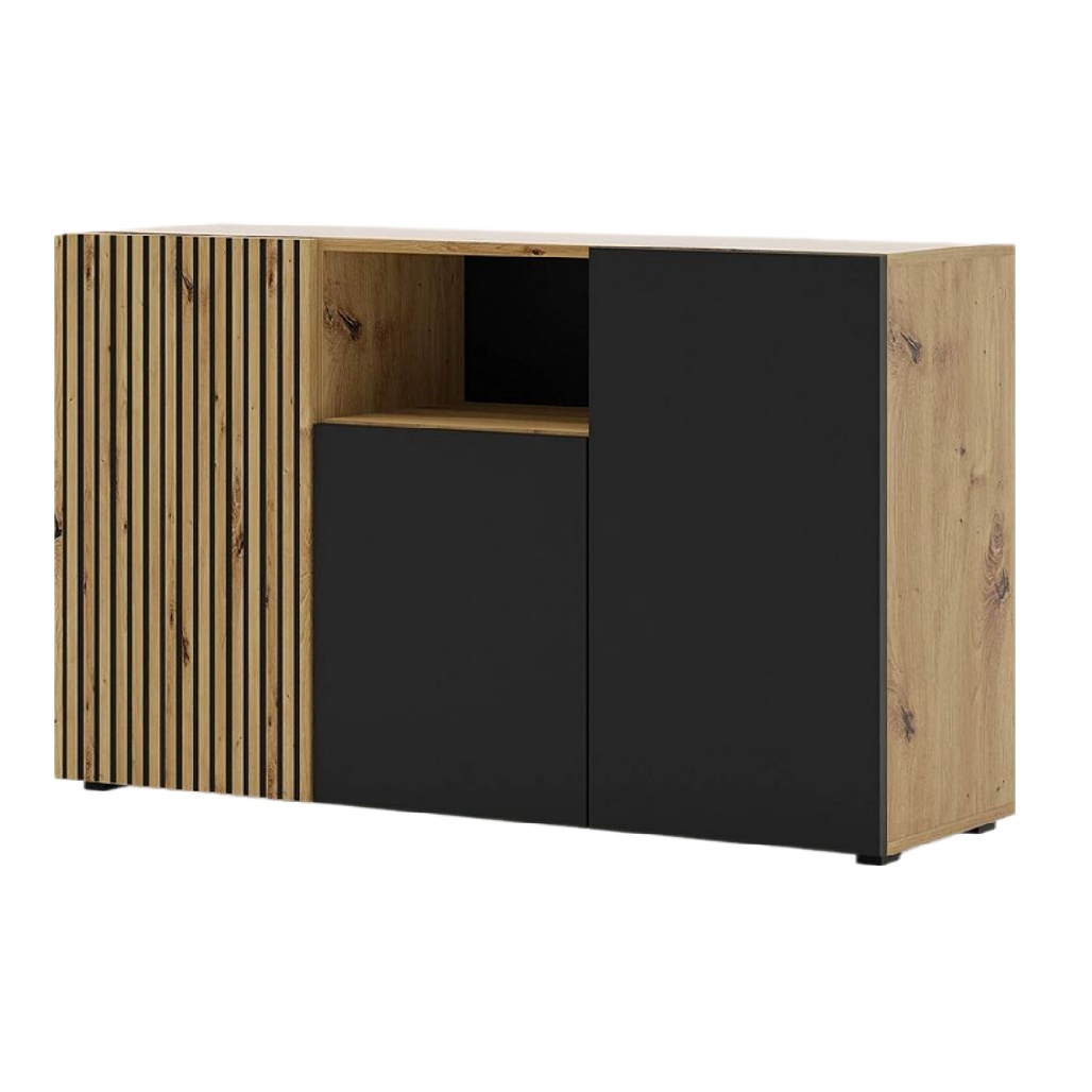 Buffet en bois avec panneaux en chêne clair et noir mat, design moderne et épuré.