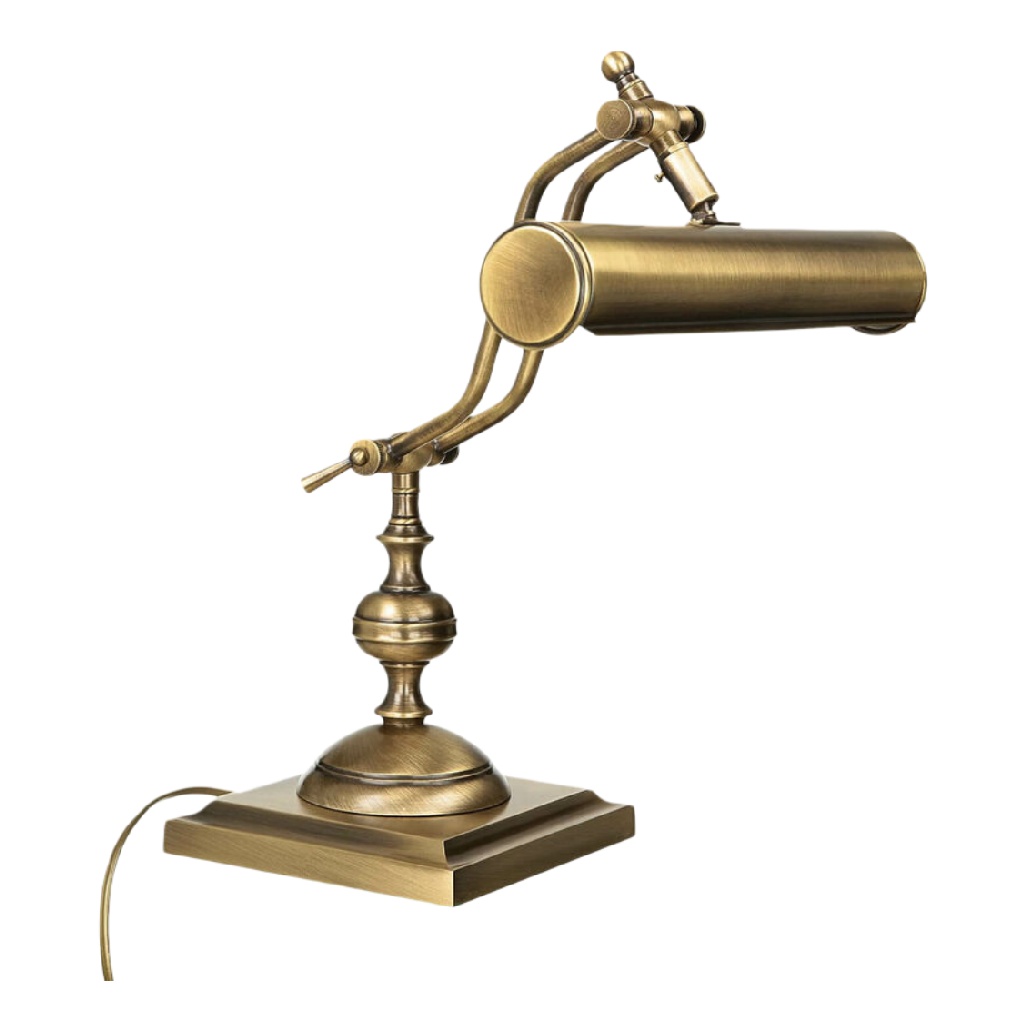 Lampe de bureau en laiton antique avec bras réglable et abat-jour orientable.